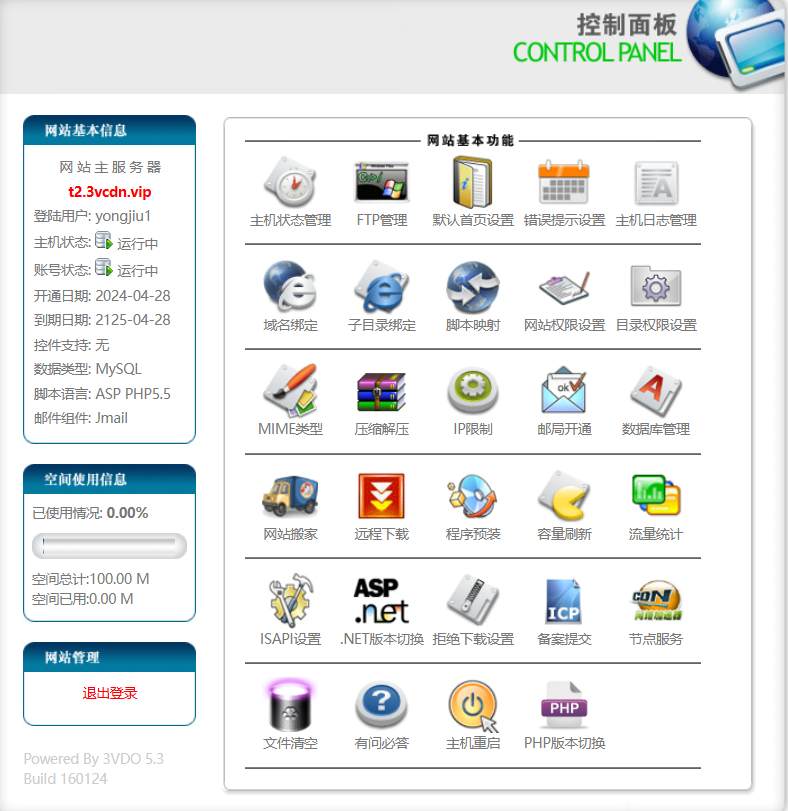 如果您要绑定域名,请点击 [域名绑定] ,根据提示即可完成操作,如果要管理FTP账号,请点击[账号管理],可以查看和修改FTP密码,,如果要在线解压压缩文件,请点击[压缩解压]。