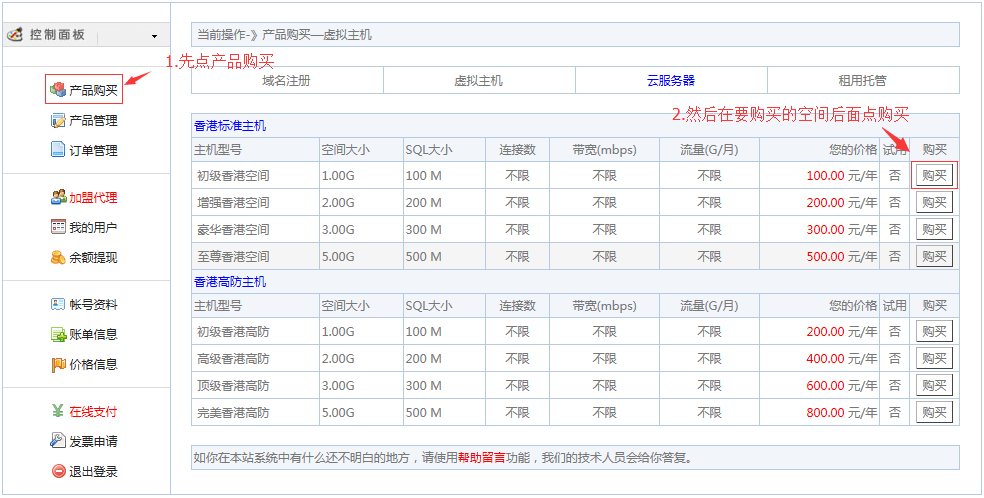 登陆之后,如果您有网银或支付宝,可以点左边的“在线支付”功能充值,如果没有网银和支付宝,也可以通过银行汇款,我们确认汇款之后,可以给您入账,之后您可以点产品购买,根据提示即可开通空间,非常简单!